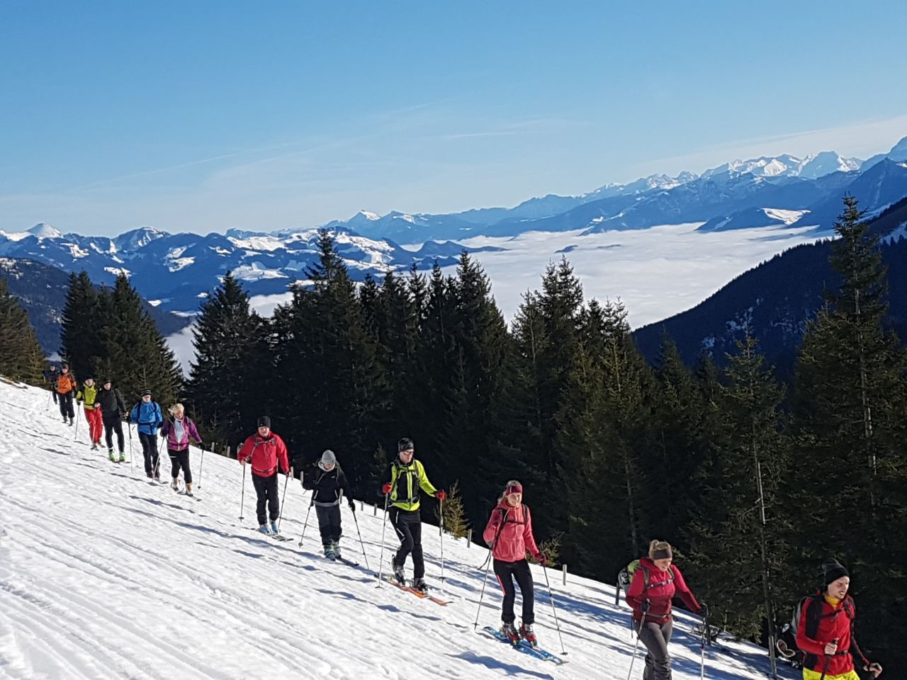 Ganz im Zeichen der "Ersten Schritte" wurde vor dem Start der Umgang mit dem Material besprochen und geübt. Nach wenigen Versuchen war jeder Teilnehmer in der Lage in und aus der Bindung zu kommen, Felle aufzuziehen sowie die Steighilfen zu nutzen.