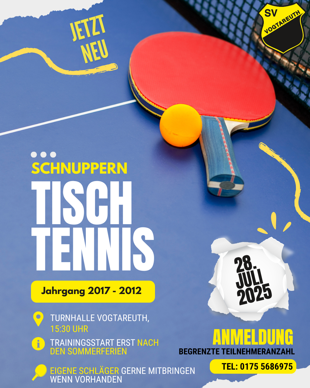 Wir freuen uns riesig, bekannt geben zu können: Unsere Tischtennisabteilung erwacht endlich wieder zum Leben! Am 28. Juli 2025 starten wir mit einem Schnuppertraining um 15:30 Uhr in der Turnhalle in Vogtareuth.