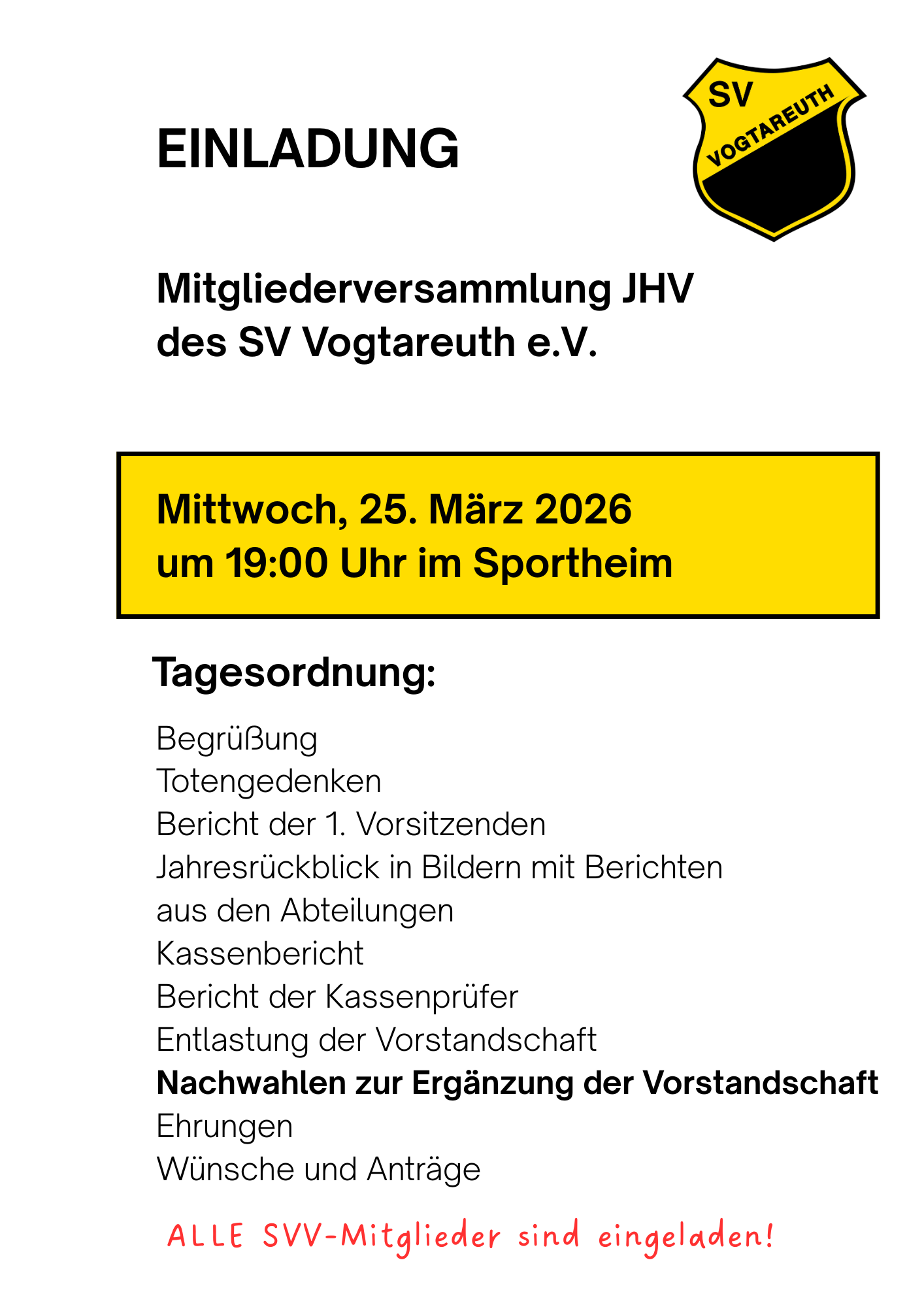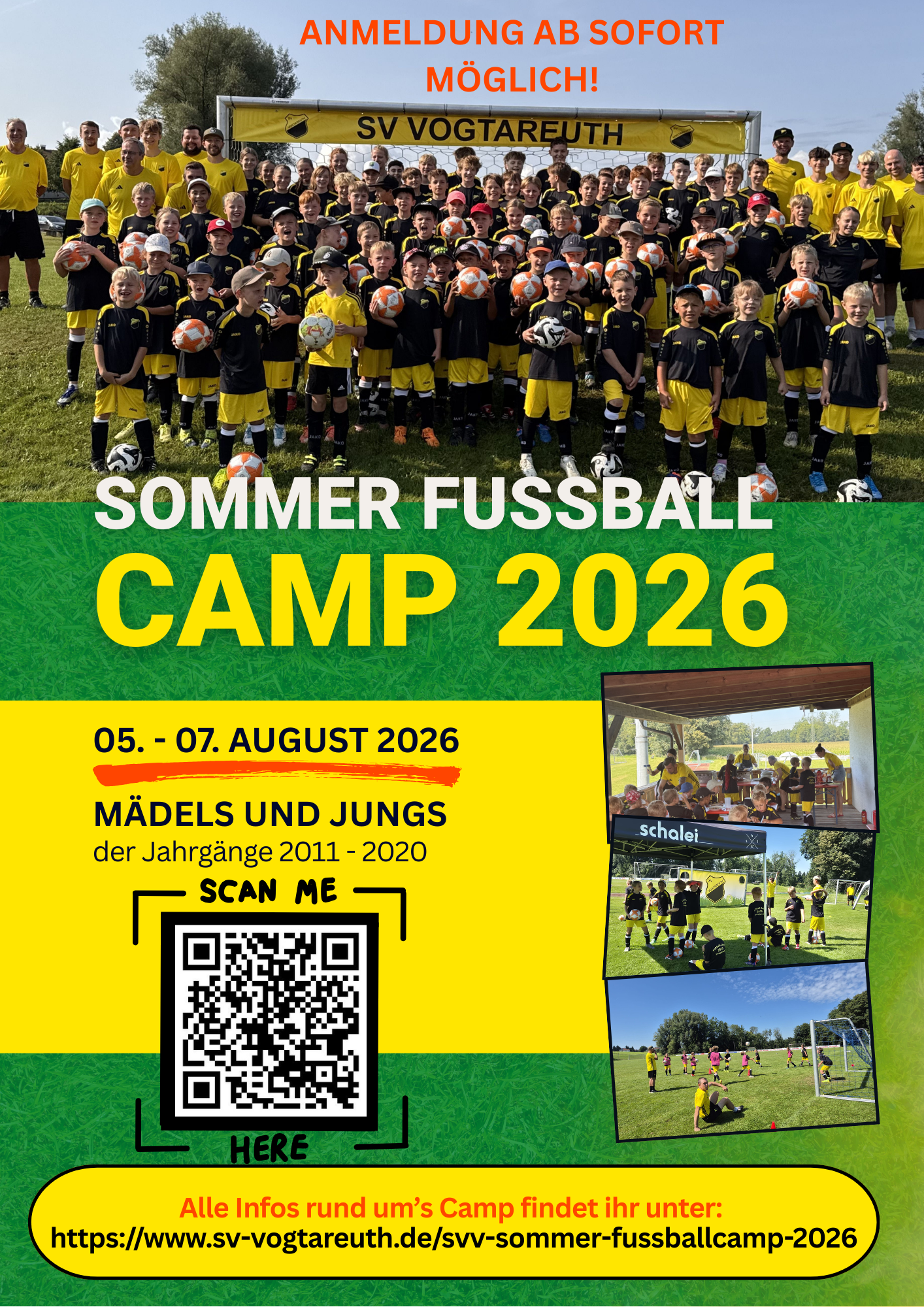 Hier findet ihr alle Infos zu unserem SVV Sommer-Fußballcamp 2026! Nach dem tollen Erfolg im vergangenen Jahr geht unser Fußballcamp beim SV Vogtareuth in die nächste Runde! Vom 5. bis 7. August 2026 dreht sich wieder alles um Fußball, Teamgeist und gemeinsame Erlebnisse auf dem Sportplatz. Freut euch auf drei erlebnisreiche Tage voller abwechslungsreicher Trainingseinheiten, spannender Spiele und ganz viel Bewegung an der frischen Luft. Egal ob Anfänger oder schon echte Nachwuchskicker*innen – bei unserem Camp steht der Spaß am Fußball im Mittelpunkt. Wir freuen uns auf euch – das wird ein Sommer-Märchen! Was euch erwartet: • Alters- und leistungsgerechtes Fußballtraining – perfekt für Anfänger*innen und Fortgeschrittene • Komplettbetreuung täglich von 9:00 bis 16:00 Uhr – drei Tage Fußballtraining mit durchgehendem Programm • Leckeres Mittagessen inkl. Getränk & Nachtisch • Obst & Wasser für zwischendurch – damit niemand schlappmacht • Coole Ausrüstung & ein eigener Ball für jeden Teilnehmer*in • Motivierte Trainer*innen & Helfer*innen , die mit viel Herzblut bei der Sache sind • Jede Menge Bewegung, Spiel, Spaß und Teamgeist • Krönender Abschluss: ein großes Abschlussturnier am Freitagnachmittag – ein echtes Highlight für Kinder und Eltern! Für wen? Alle Jungs und Mädchen der Jahrgänge 2011 bis 2020 , die beim SVV aktiv sind oder einfach Lust auf Fußball, Bewegung und ein tolles Ferienerlebnis haben. Teilnahmegebühren: • 135 € für das erste Kind (Nicht-Mitglieder: 155 €) • 125 € für das 1. Geschwisterkind (Nicht-Mitglieder: 145 €) • 115 € für jedes weitere Geschwisterkind (Nicht-Mitglieder: 135 €) Die Anmeldung ist ab sofort unter https://form.jotform.com/260316499329364 möglich. Anmeldeschluss ist Freitag, der 22. Mai 2026.