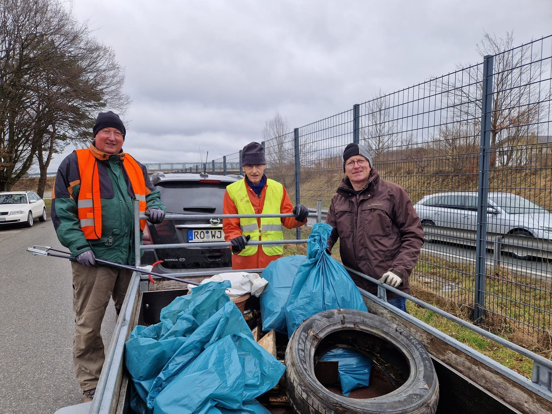Eine weitere Gruppe machte sich mit Anhänger auf den Weg, um den Parkplatz und das Waldrandgebiet an der Kreisstraße von Lueg nach Oberwindering in Angriff zu nehmen. Neben Autoreifen, Kanistern, Flaschen, Brotzeittüten etc. wurde alles Mögliche gefunden.