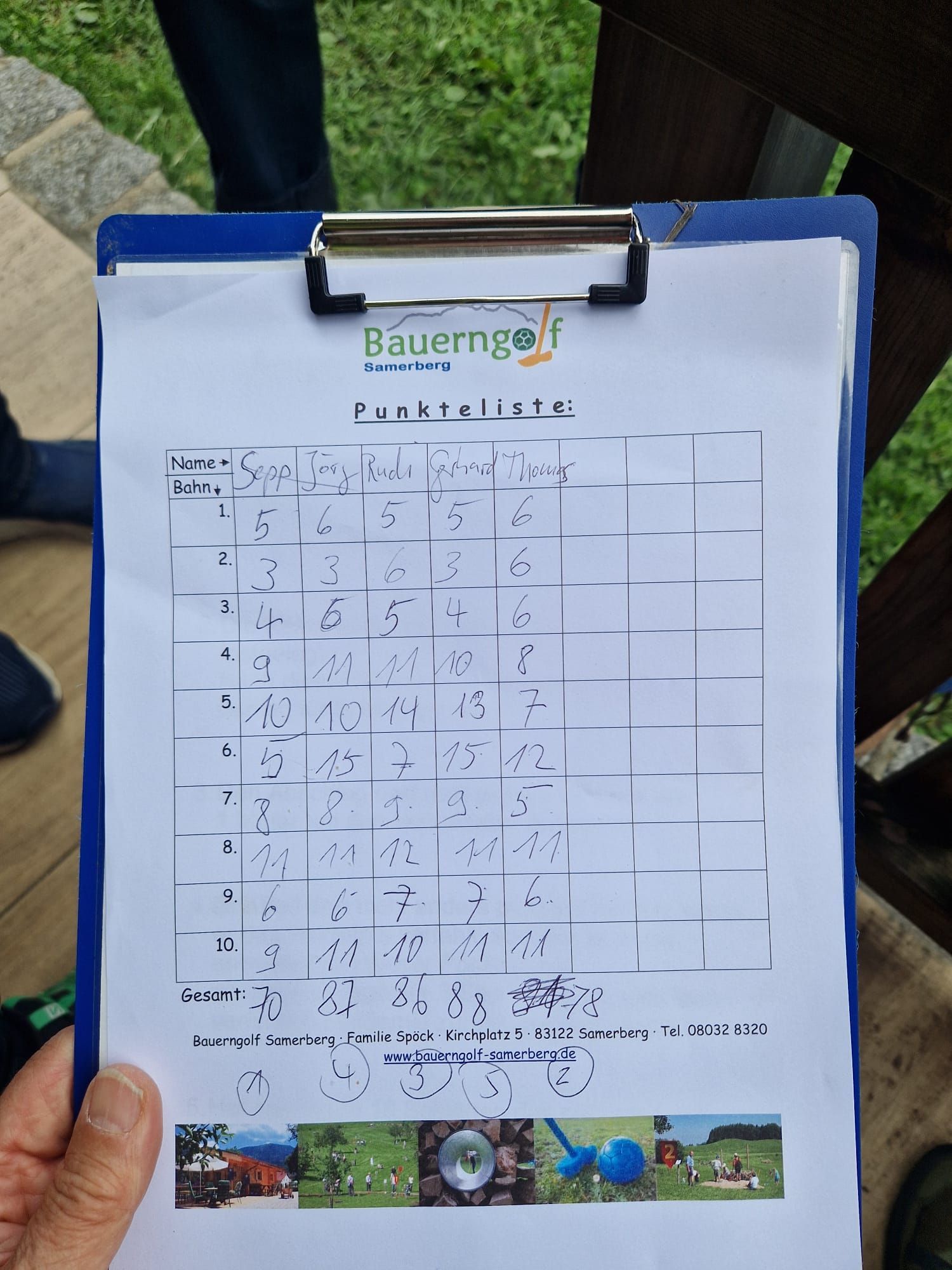 Es hat uns allen einen Riesen Spaß gemacht und wir können das „Bauerngolfen“ am Samerberg ob klein oder groß wärmstens weiterempfehlen. Sepp Bock (aktiver Tennisspieler) erwies sich als wahrer Champion und belegte den 1. Platz. Sepp wurde dafür mit einem Gutschein belohnt.